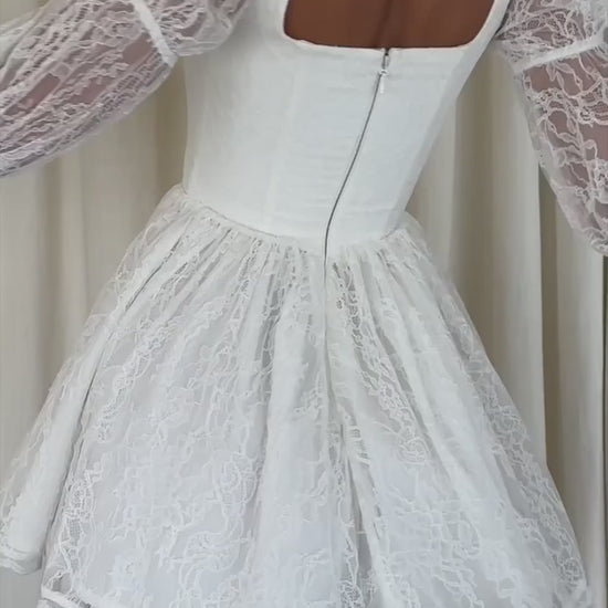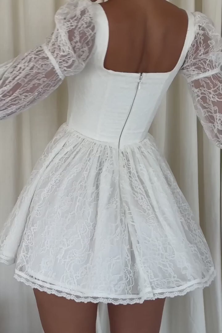 O Vestido Rossano é lindamente confeccionado com uma renda floral delicada em um tom de branco neve, perfeito para os dias quentes. Com um decote quadrado e um corpete modelador, ele realça a cintura de maneira sofisticada. As mangas soltas e dramáticas completam o look, adicionando um toque de elegância.