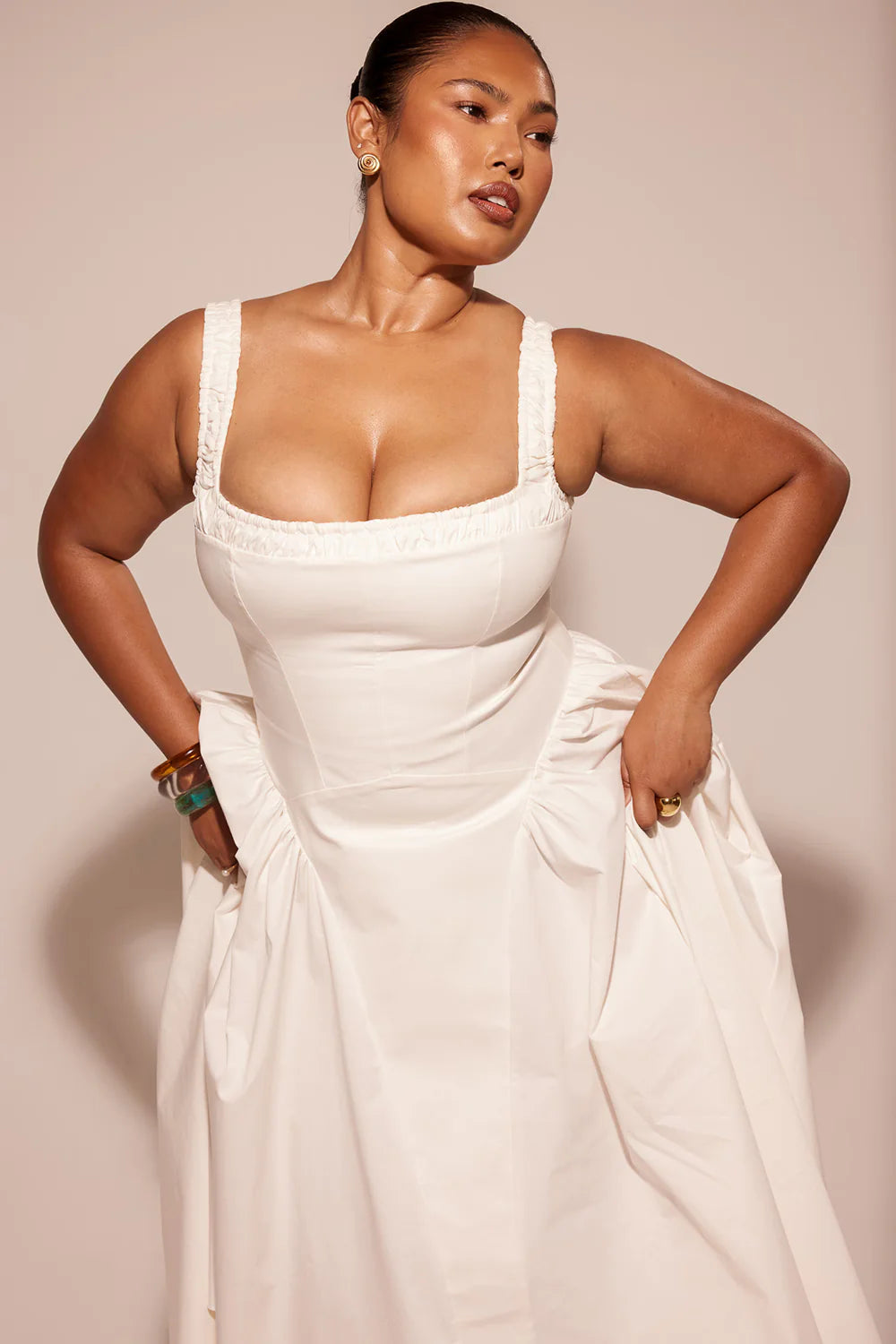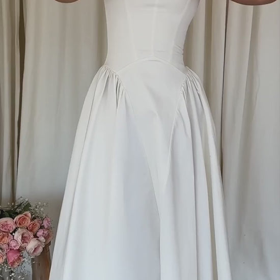 'Arese' é luxuosamente confeccionado com nosso algodão elástico sustentável, em um tom branco neve. Nós adoramos silhuetas românticas, e o 'Arese' é a adição perfeita à nossa coleção La Pétale.