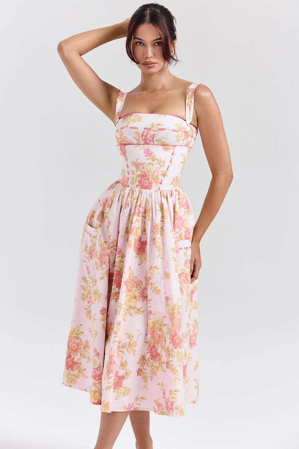 Na mais linda estampa de Papoula Pêssego, 'Bolsena' é facilmente o nosso vestido favorito desta coleção. Feito com tecido de algodão elástico, as fitas no corpete destacam sua cintura, proporcionando um contraste feminino perfeito. Amamos o toque delicado dessas fitas!